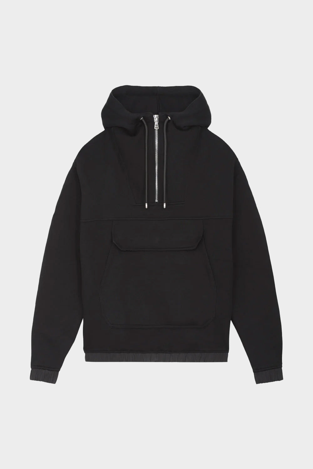 hoodie noir avec zip, poche en doublure K-Way, logo silicone derrière la capuche en haut du dos finition nylon au bout des manches