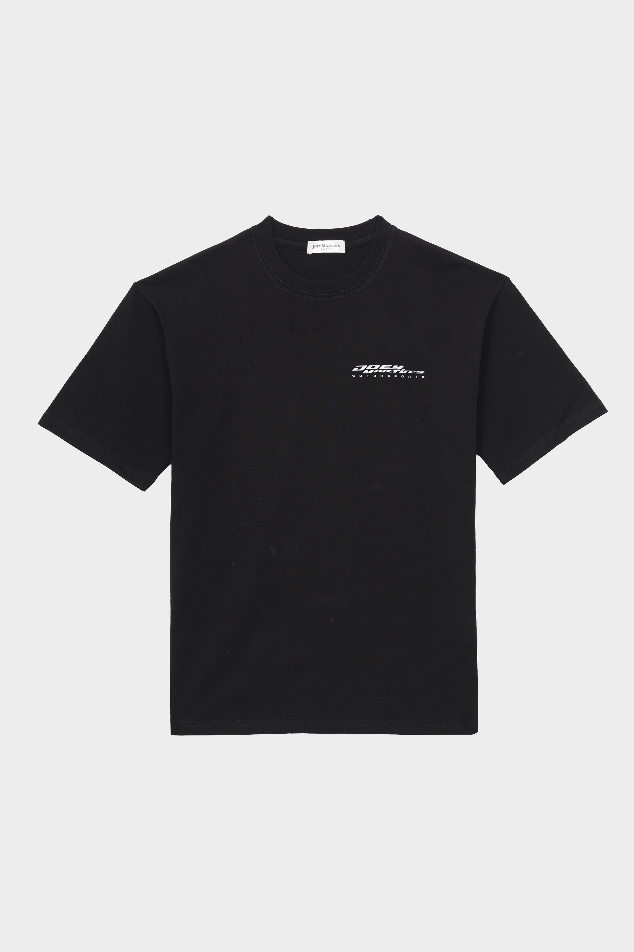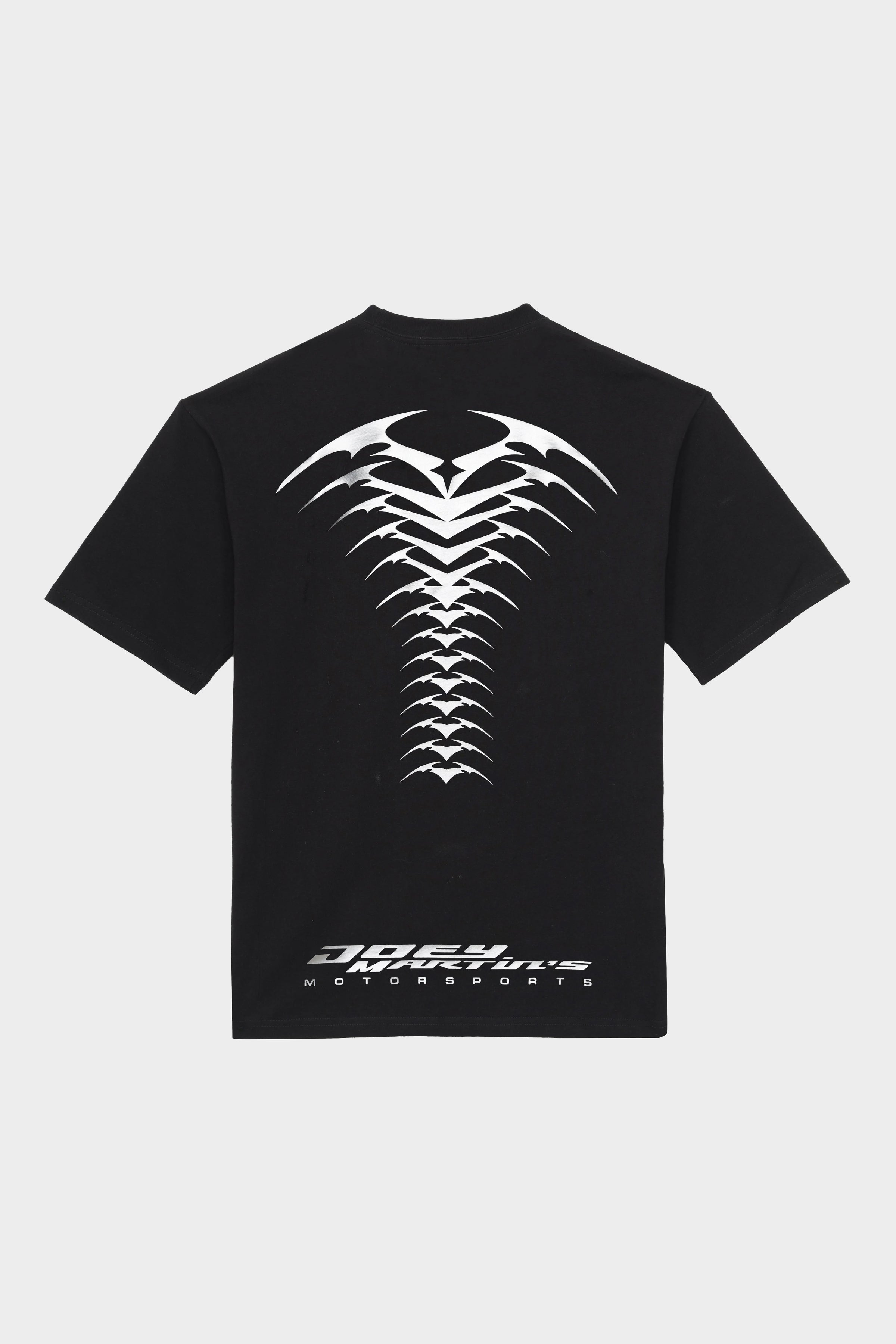 T-shirt noir coupe oversize, avec une impression argentée mêlant univers Motorsport et squelette pour un style radical et percutant.